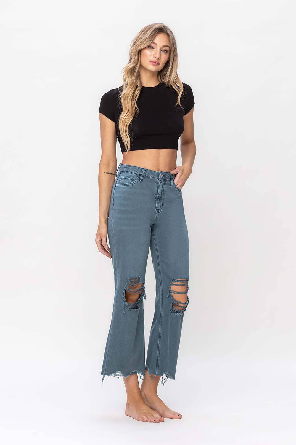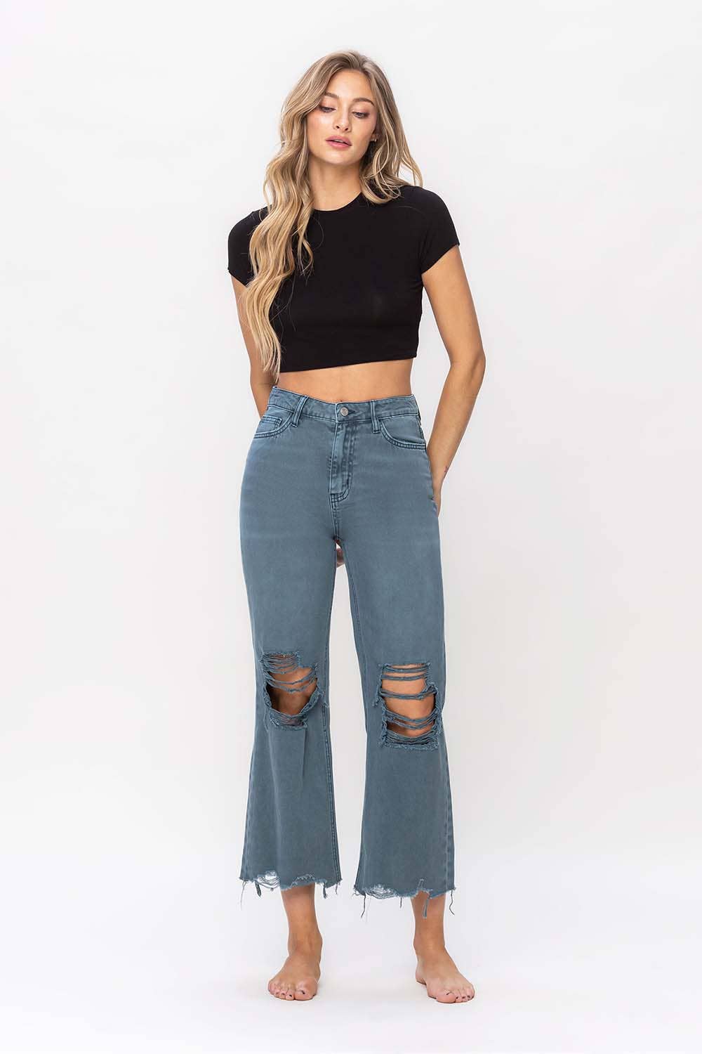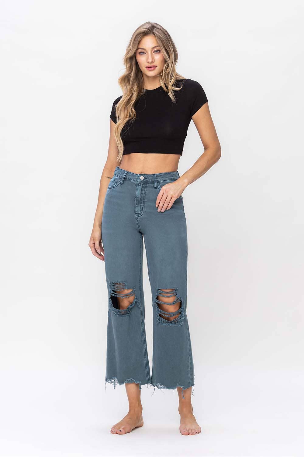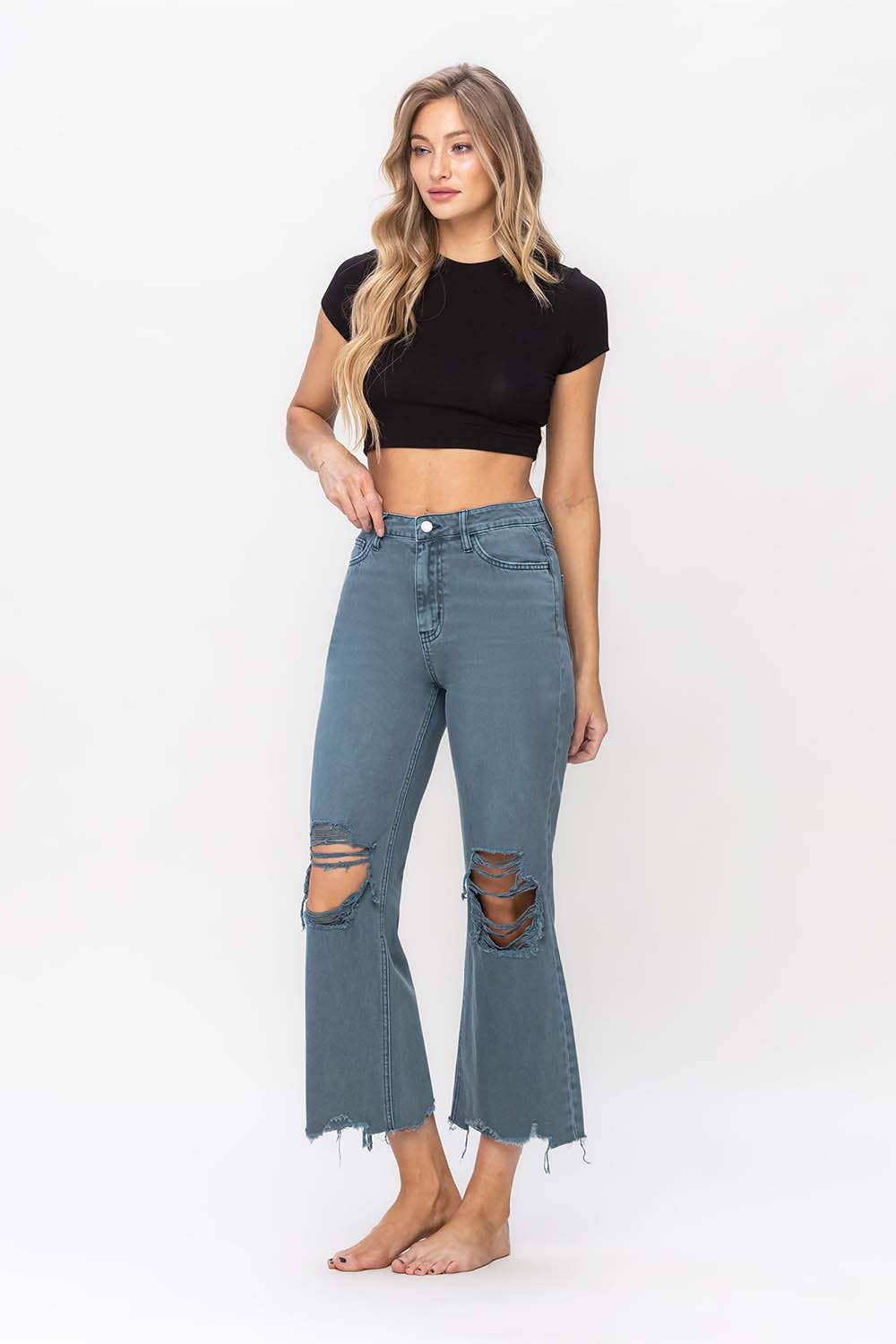 90's vintage crop flare jean v2736ba - non stretch denim, distressed detail, high waisted, relaxed legs, flare jean, cropped length, wide leg, authentic rigid jeans texture, 90's vintage jeans f. rise: 11 1/2" / inseam: 27'' / leg opening: 20'' model is 5' 9'' wearing size 26 #flyingmonkeyjeans #vervetdenim