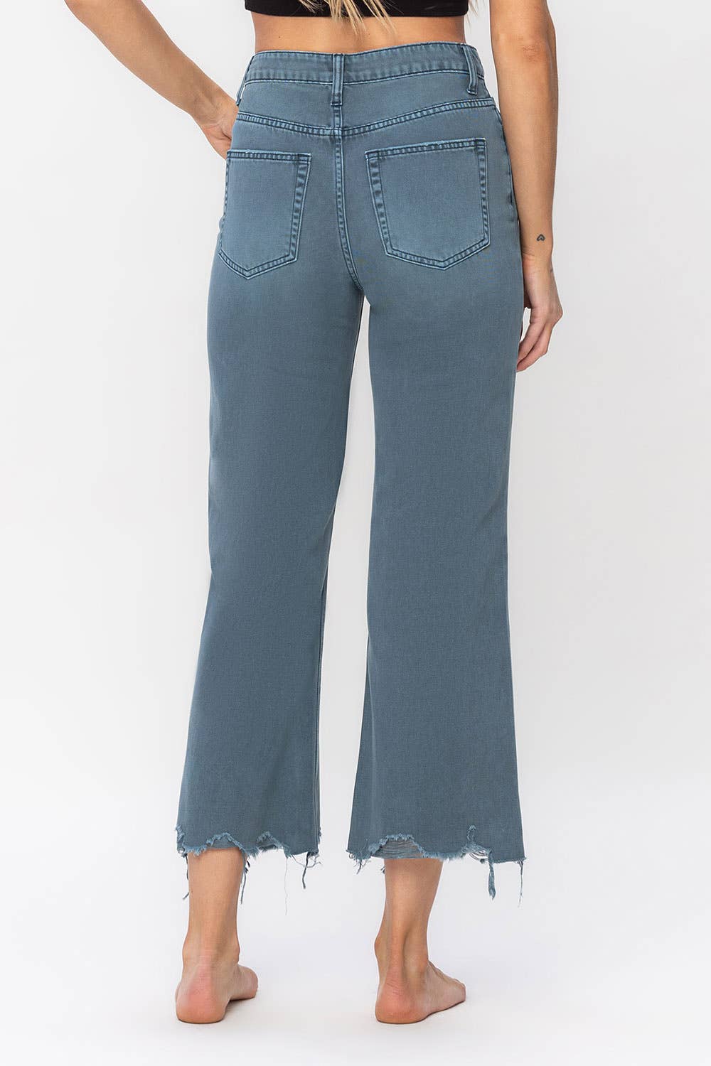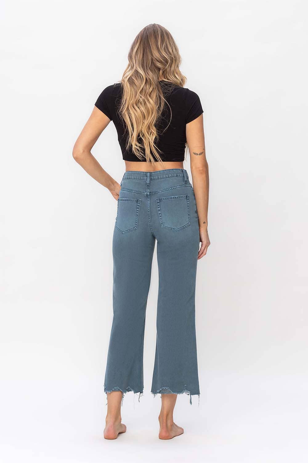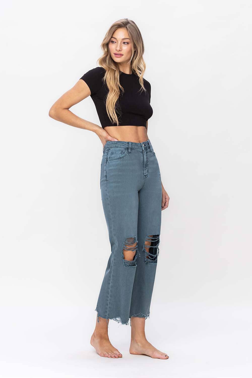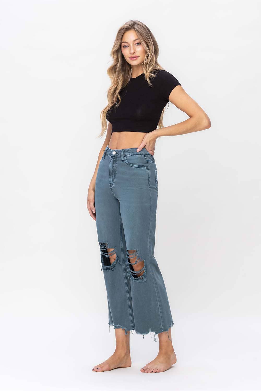 90's vintage crop flare jean v2736ba - non stretch denim, distressed detail, high waisted, relaxed legs, flare jean, cropped length, wide leg, authentic rigid jeans texture, 90's vintage jeans f. rise: 11 1/2" / inseam: 27'' / leg opening: 20'' model is 5' 9'' wearing size 26 #flyingmonkeyjeans #vervetdenim