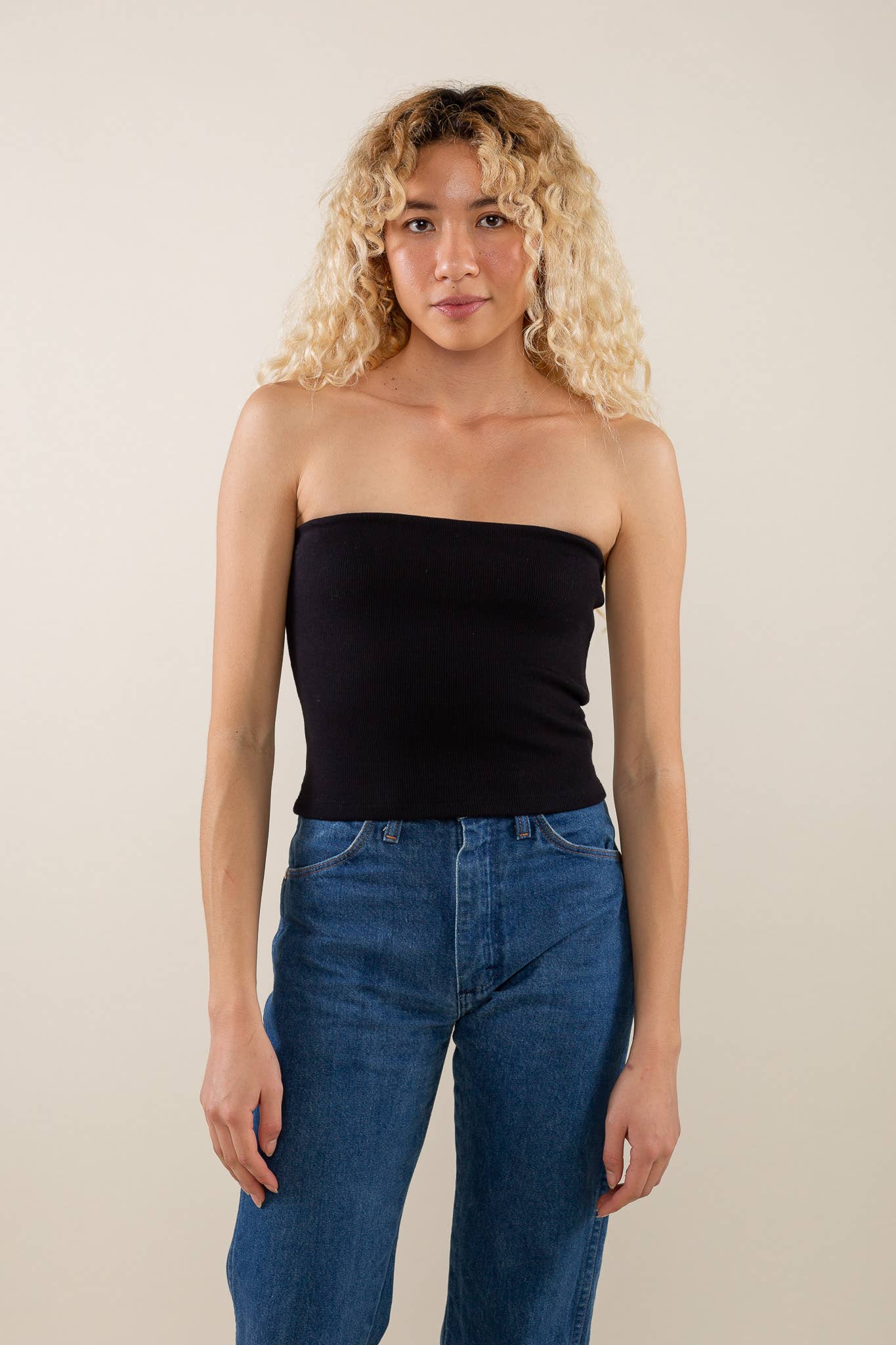 Simple and clean. Double layered 2x1 rib tube bandeau for extra support and compression. Fabric is a compressive 2x1 cotton rib that has been knit to our specifications in LA.