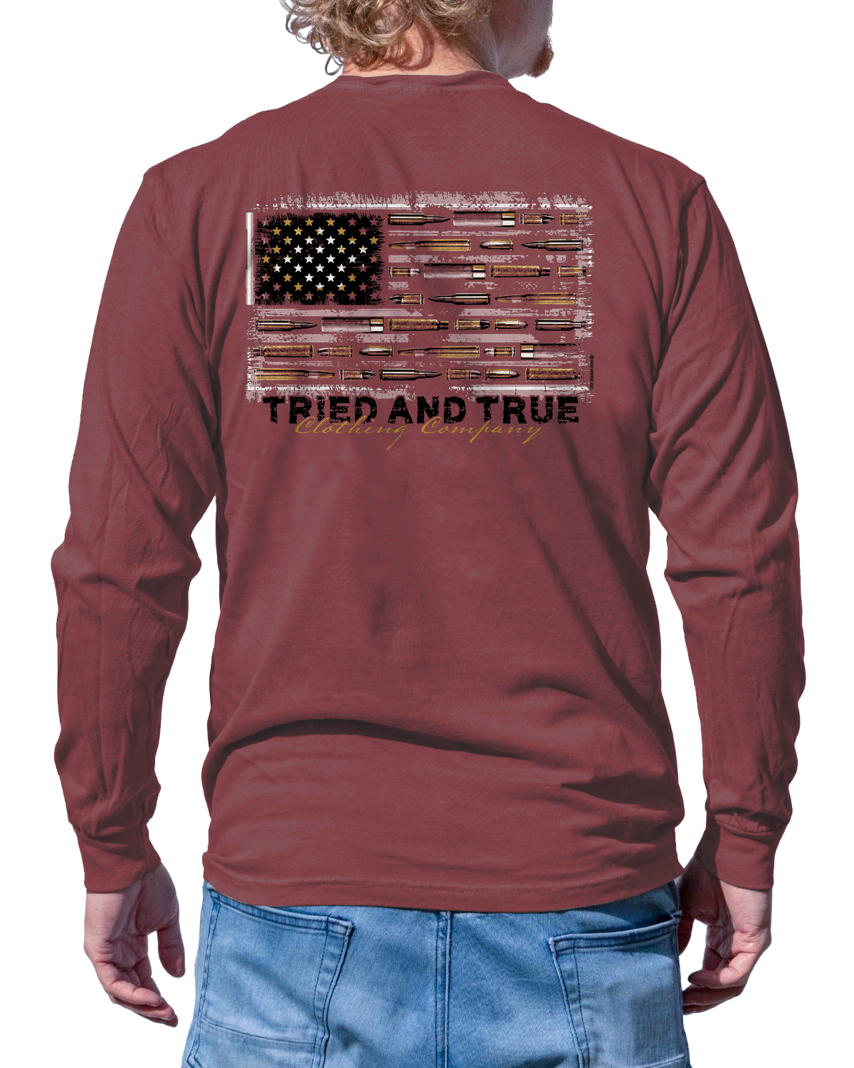 Bullet Flag Long Sleeve T-Shirt in Crimson. Printed on an 100% Cotton Ring-spun Garment Washed T-Shirt
