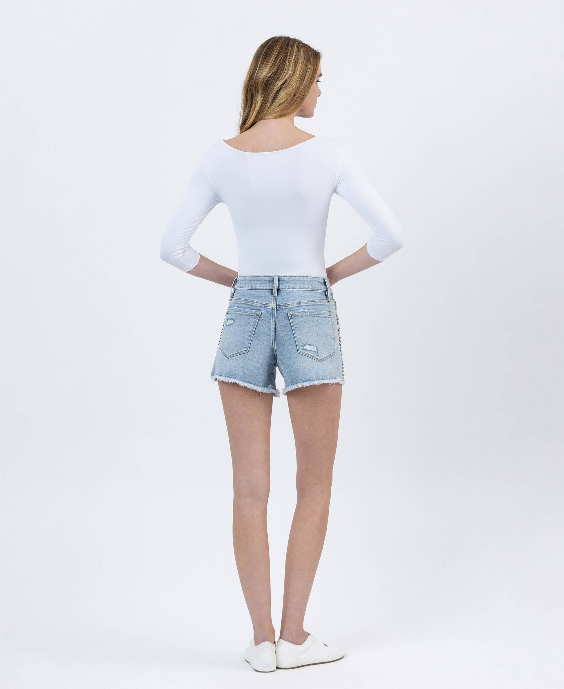 Model is 5'10" Wearing a size small. High rise distressed studded denim shorts Comfort stretch denim, high rise waist, distressed detail, frayed hem, studded denim shorts
