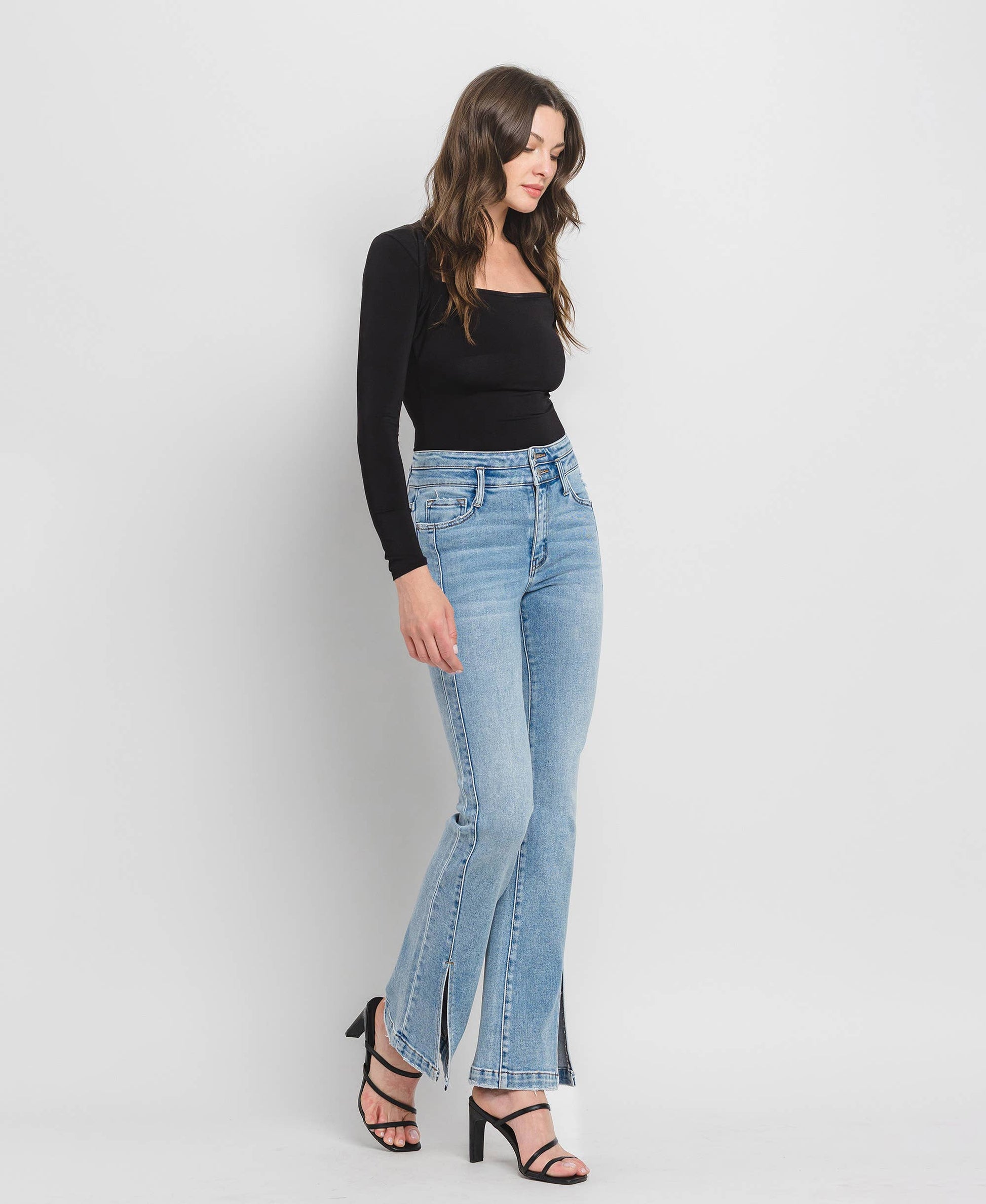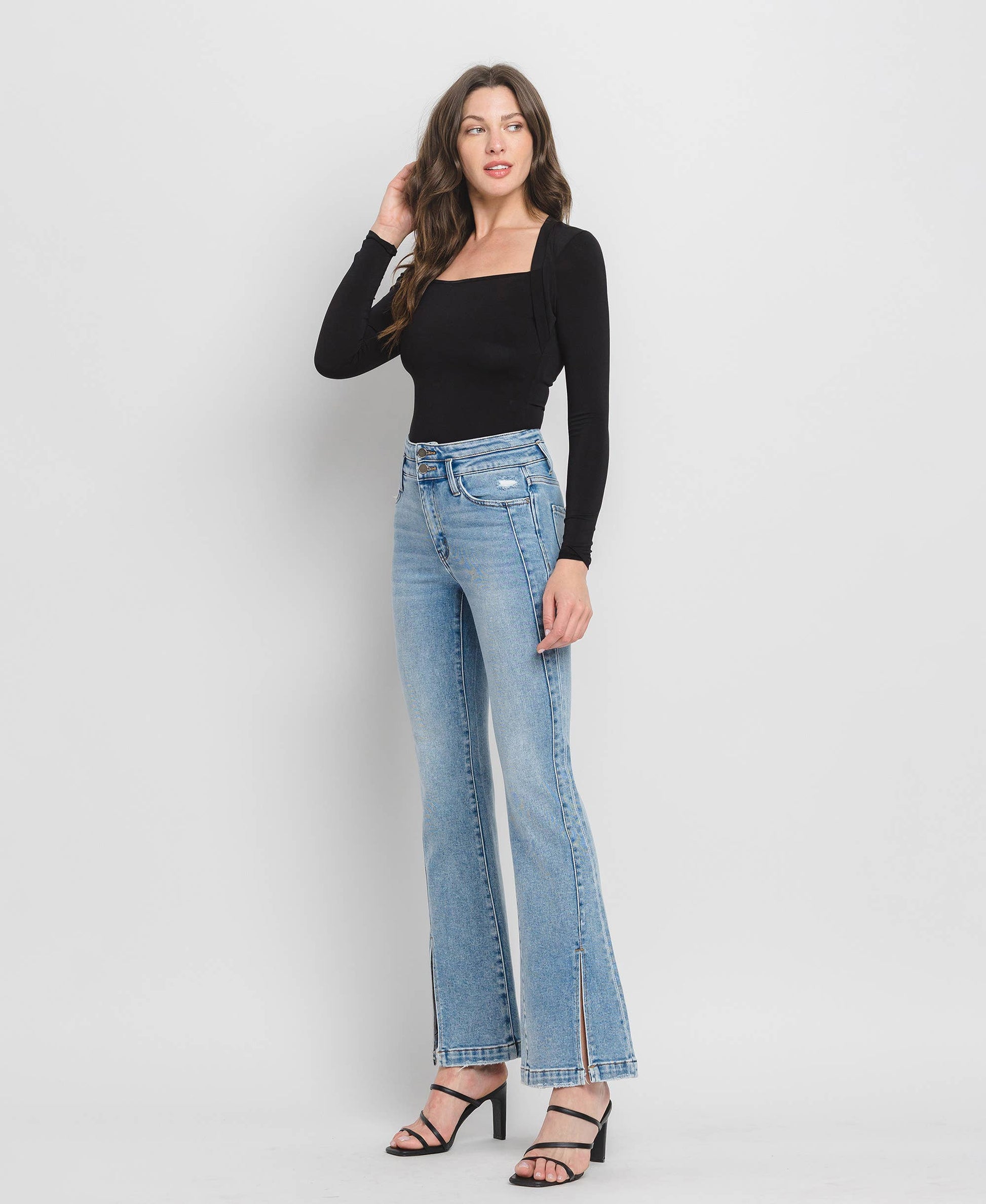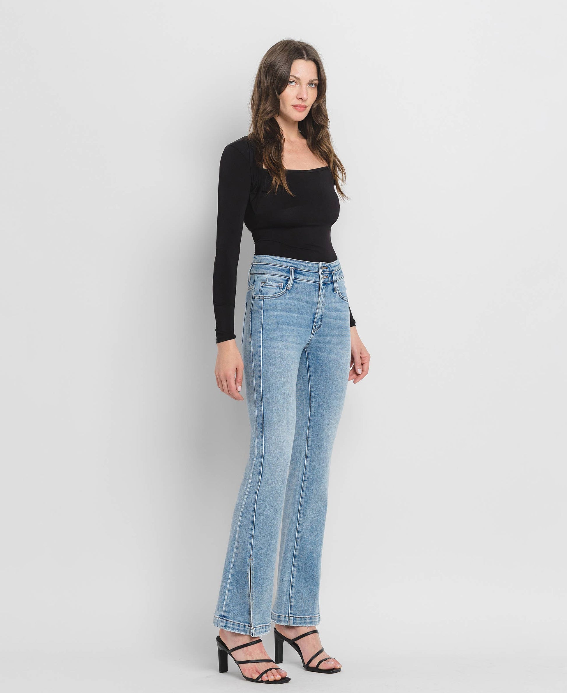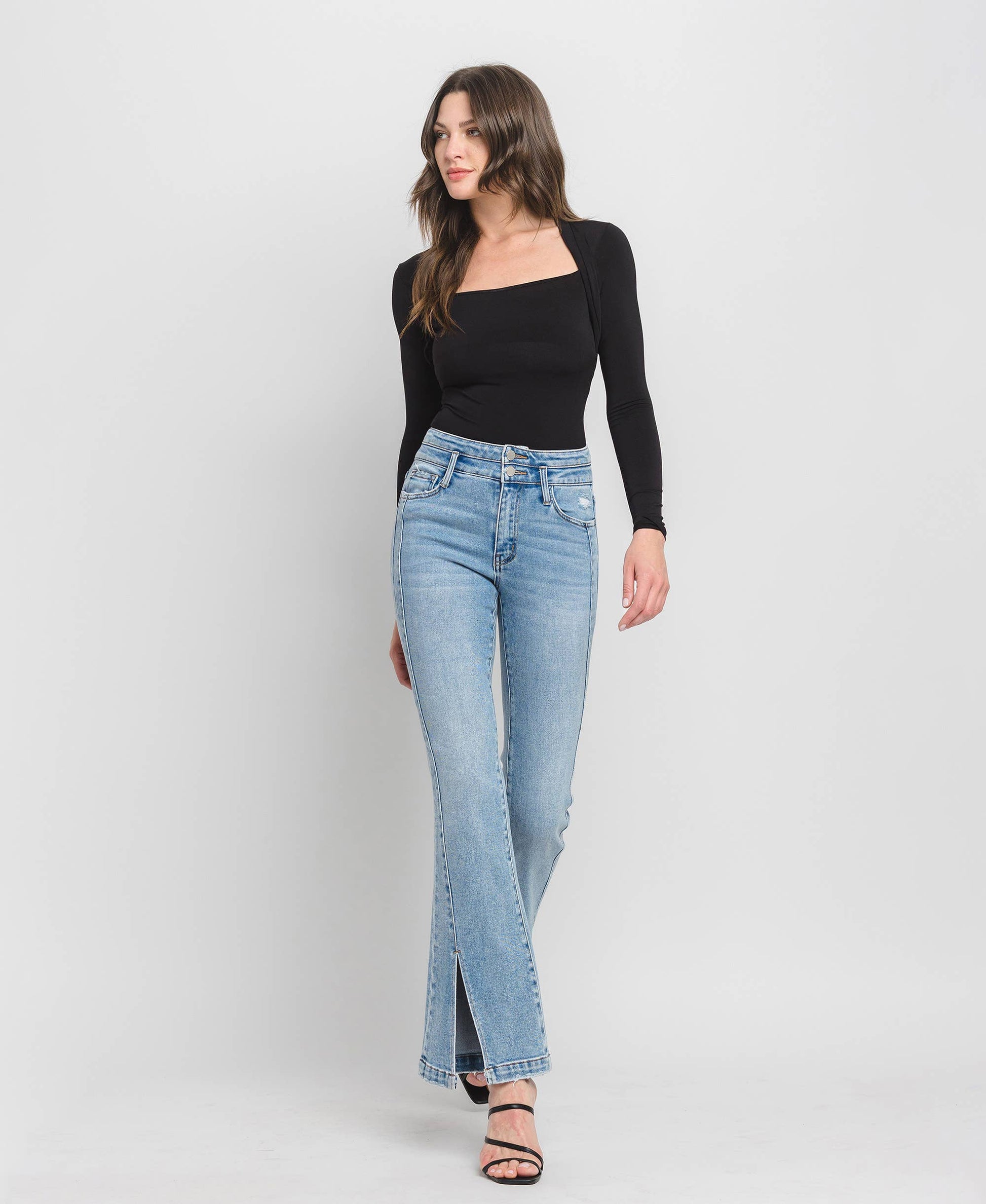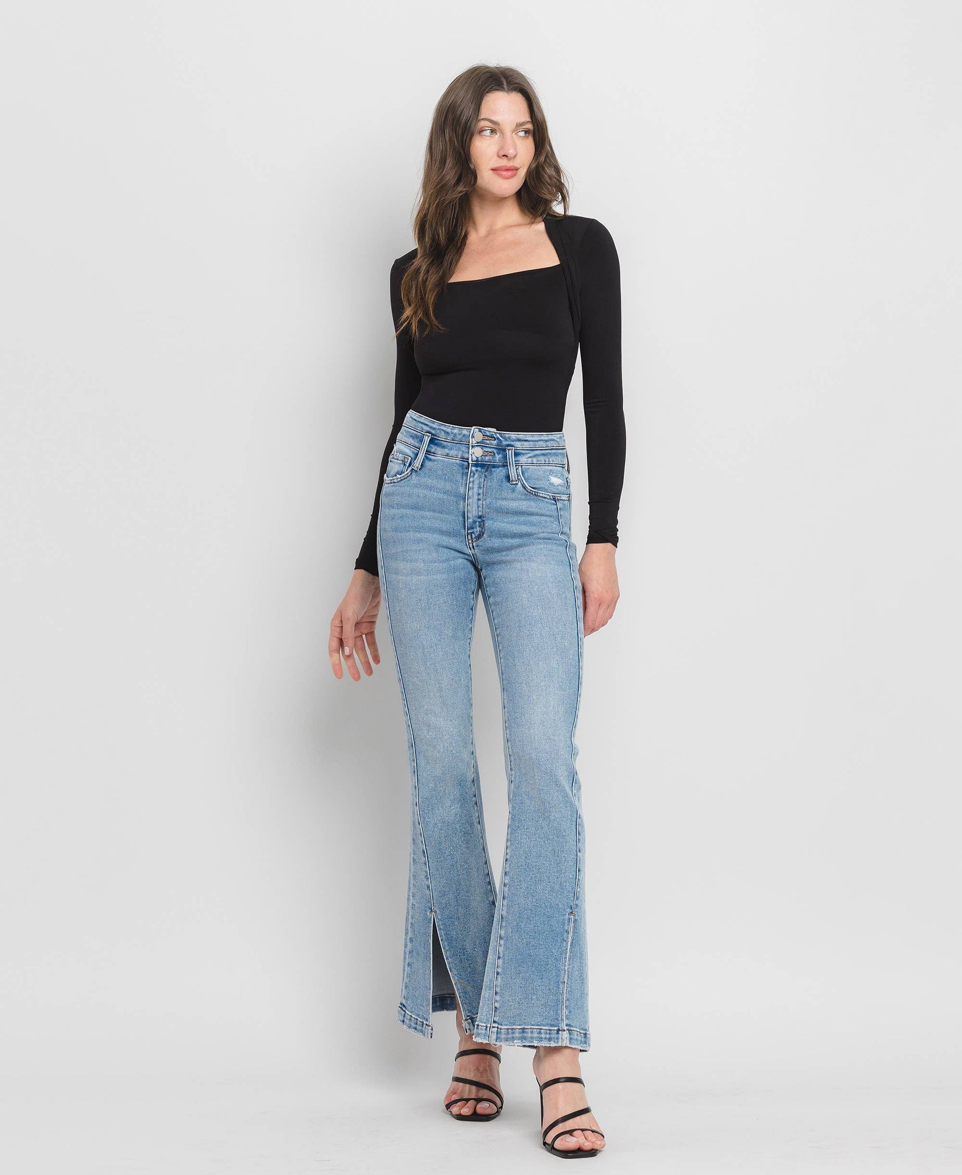 High Rise Slit Detail Flare Jeans Comfort Stretch Denim, High Rise Waist, Slit Detail, Full Length, Flare Jeans F. Rise: 10" / Inseam: 33" / Leg Opening: 19 1/2" Model Is 5'9" Wearing Size 26