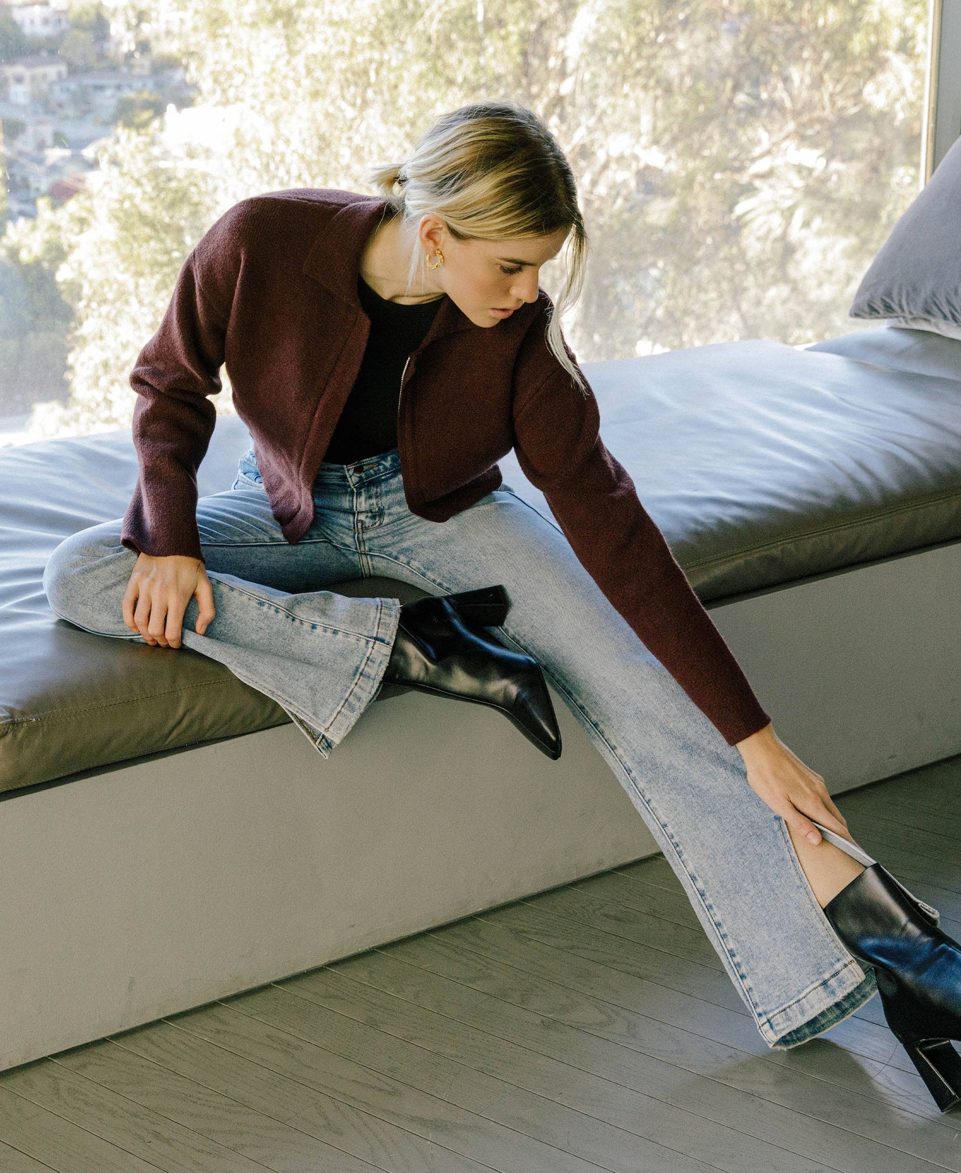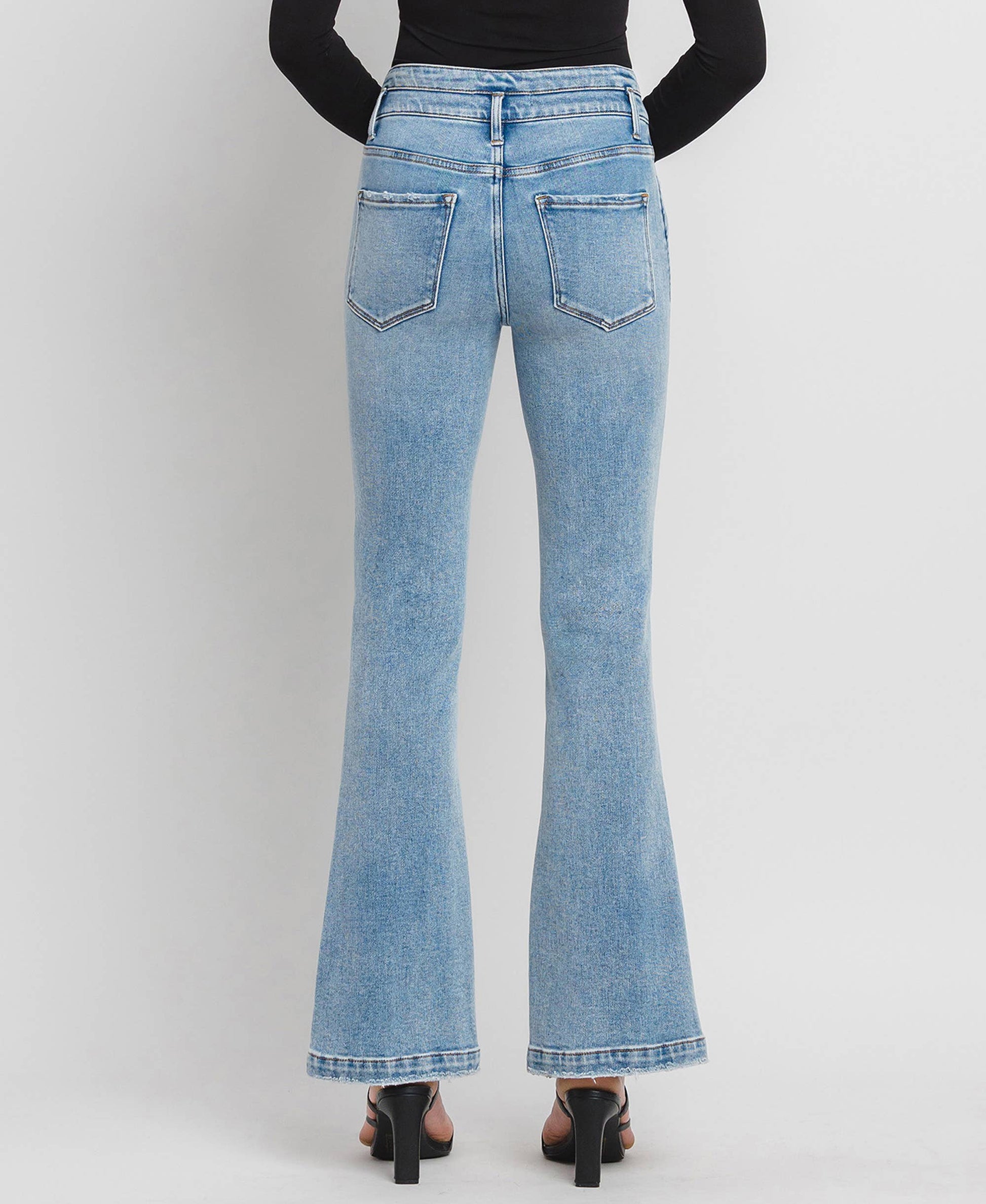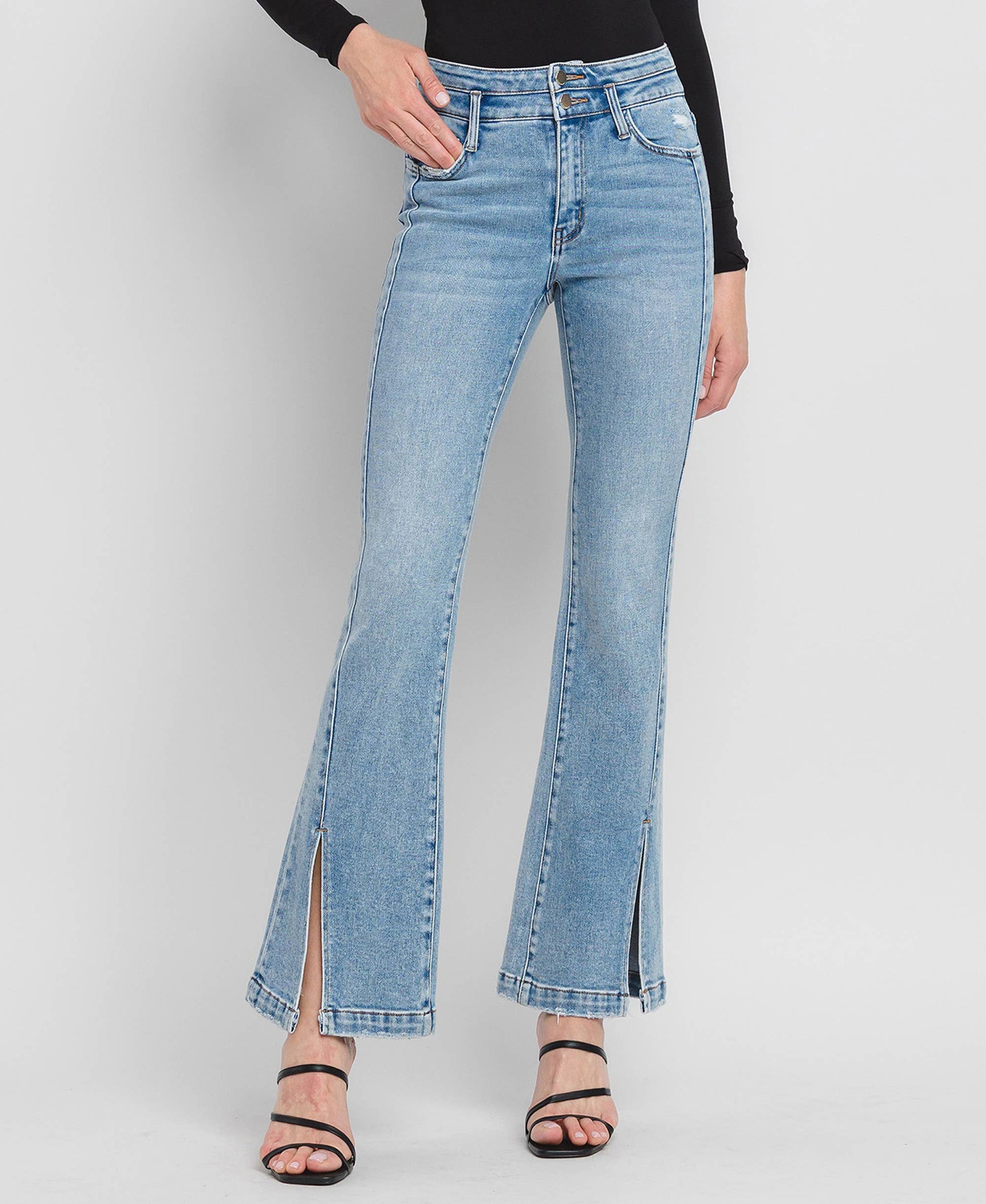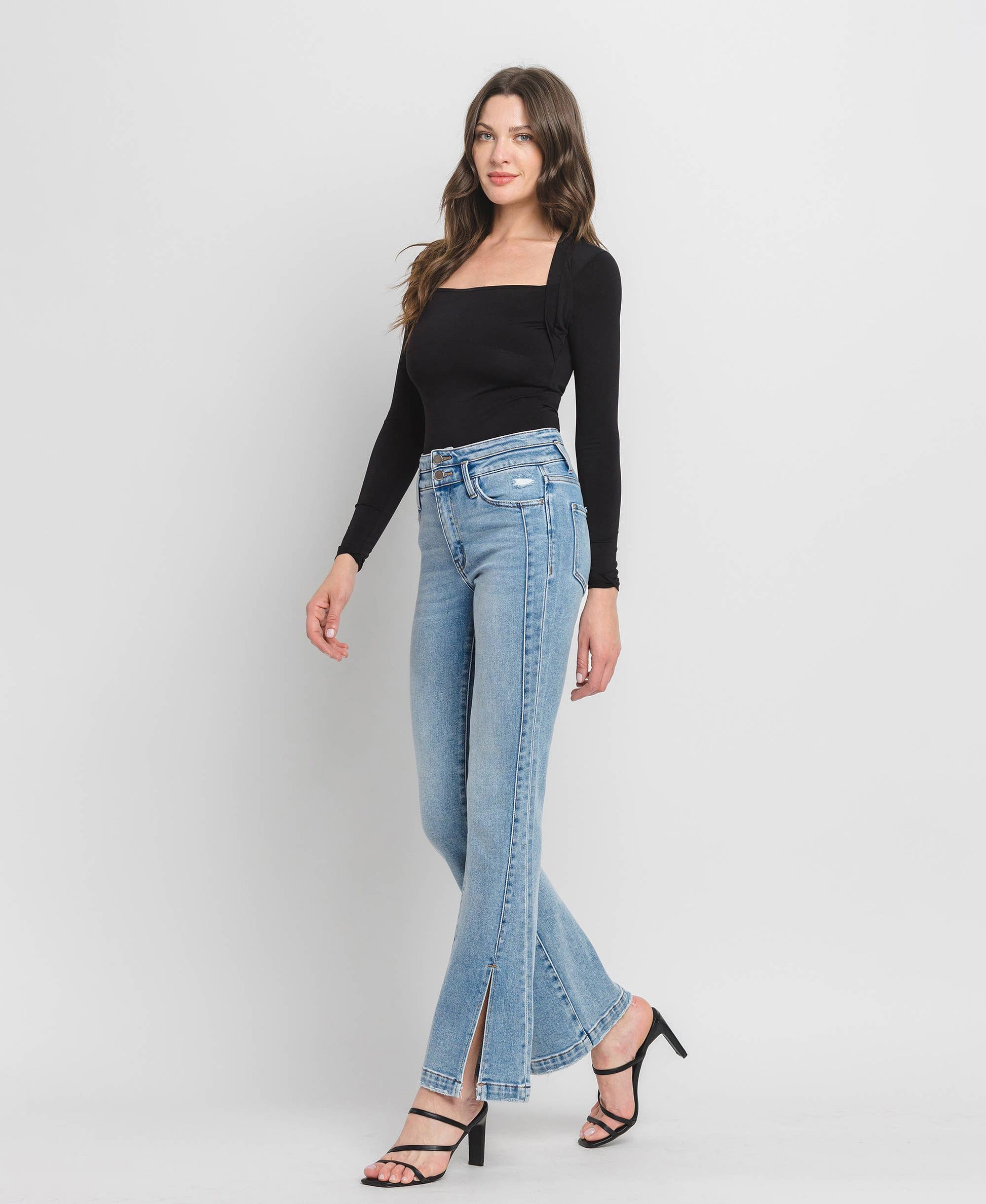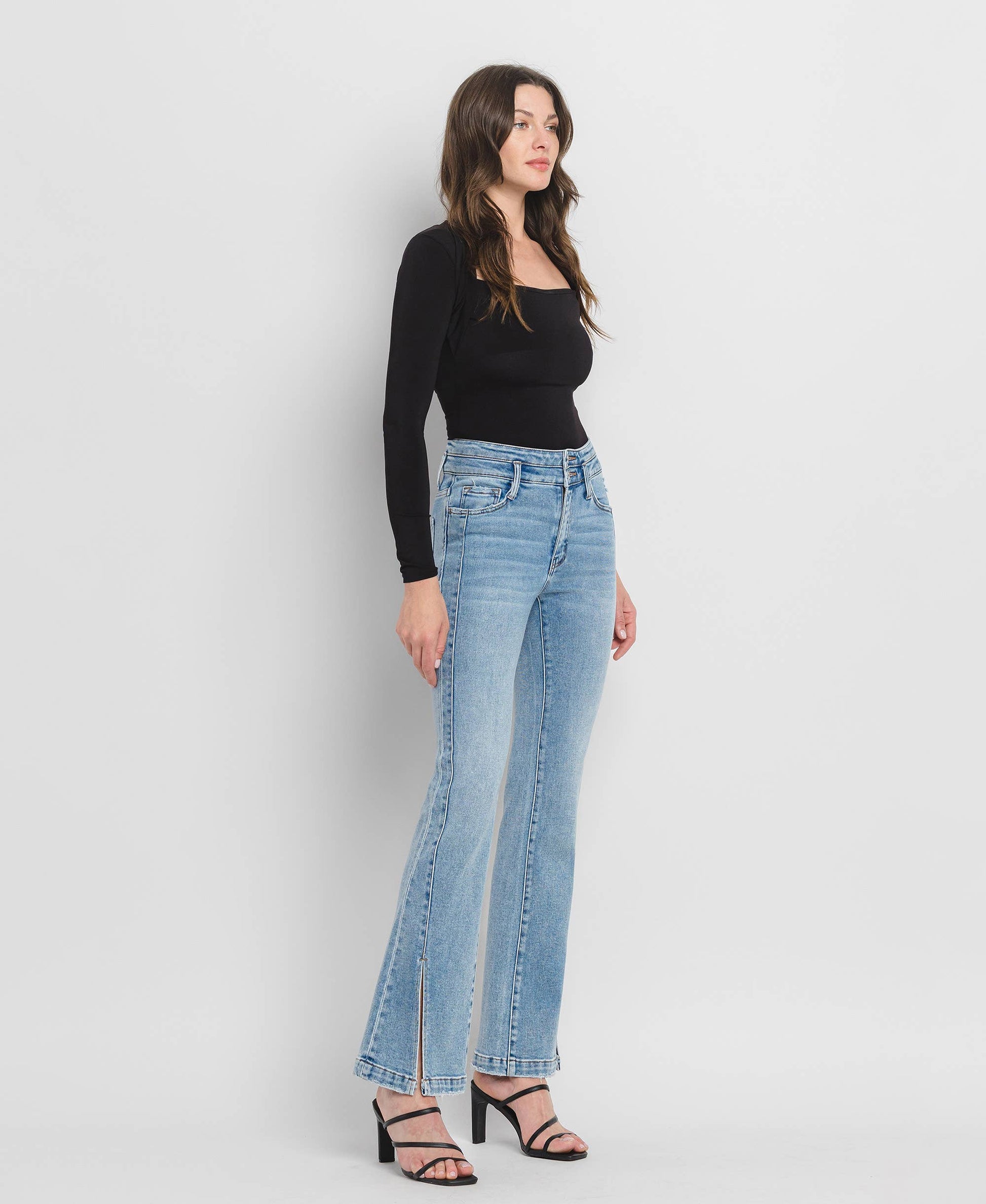 High Rise Slit Detail Flare Jeans Comfort Stretch Denim, High Rise Waist, Slit Detail, Full Length, Flare Jeans F. Rise: 10" / Inseam: 33" / Leg Opening: 19 1/2" Model Is 5'9" Wearing Size 26