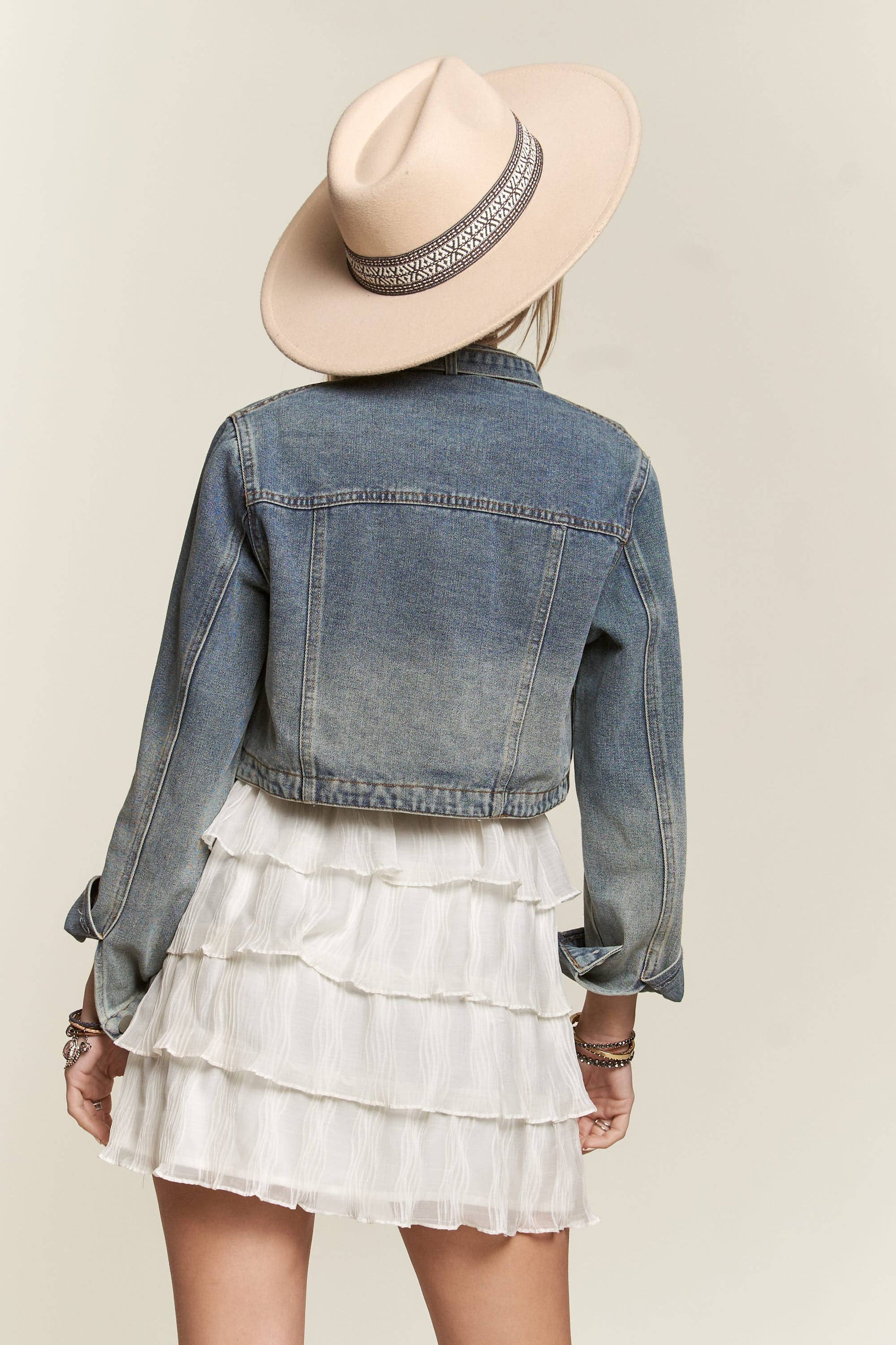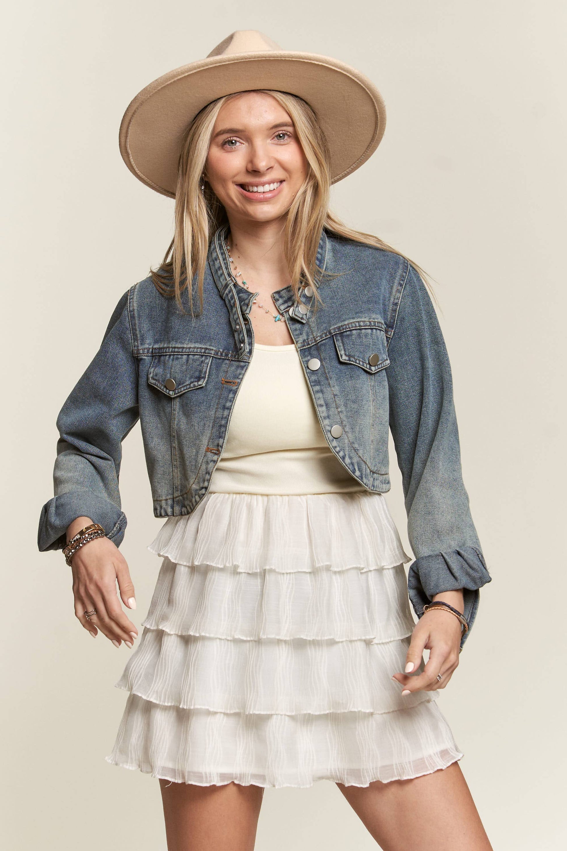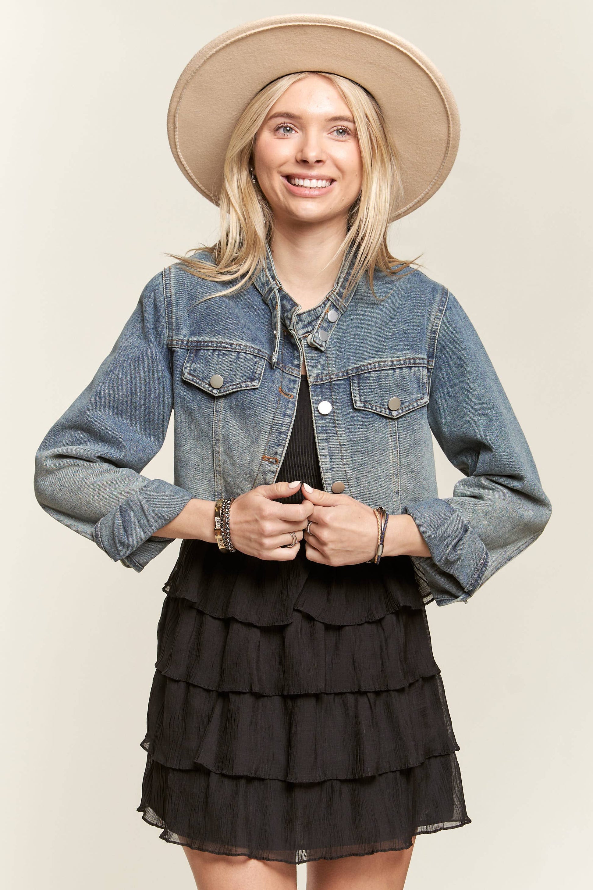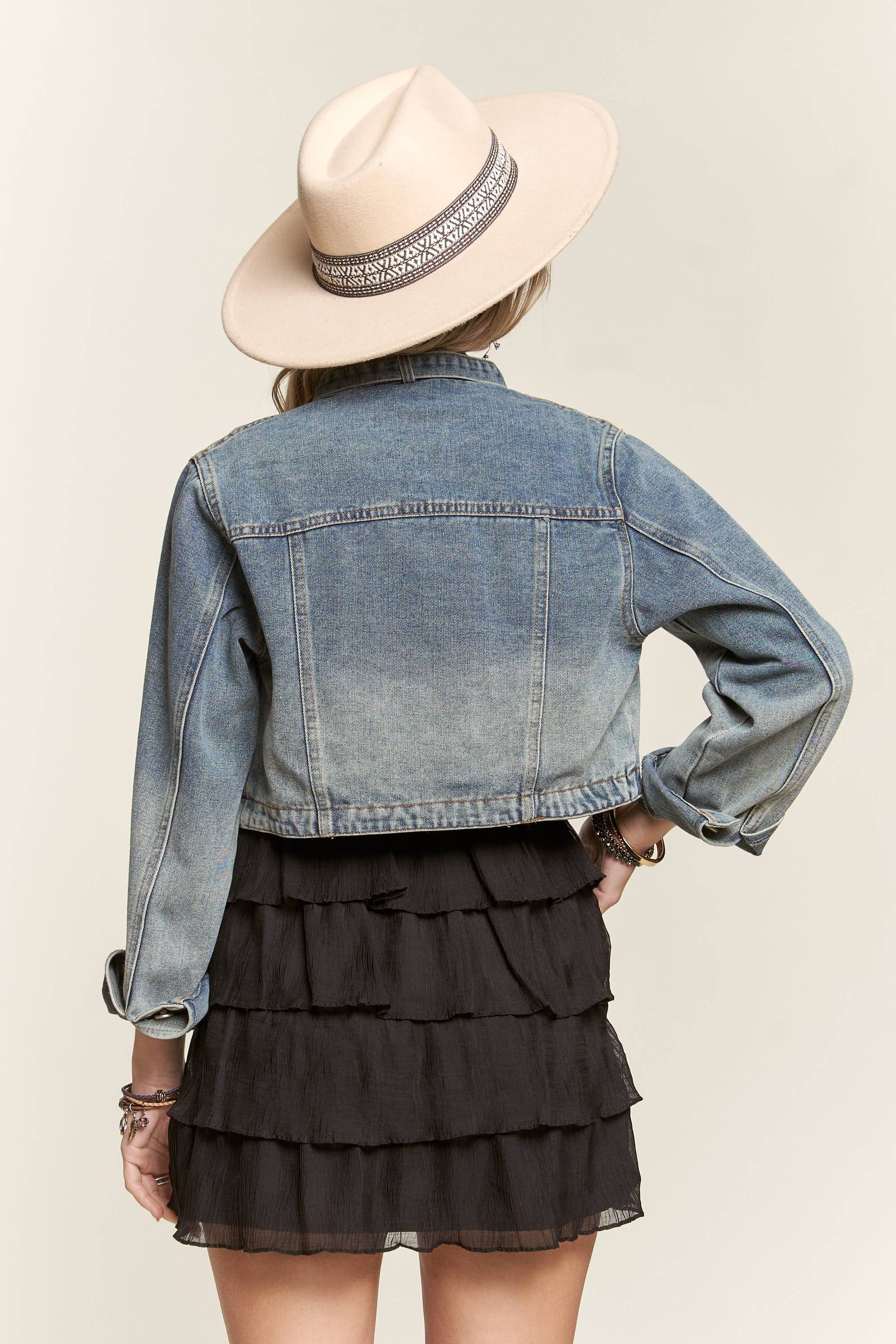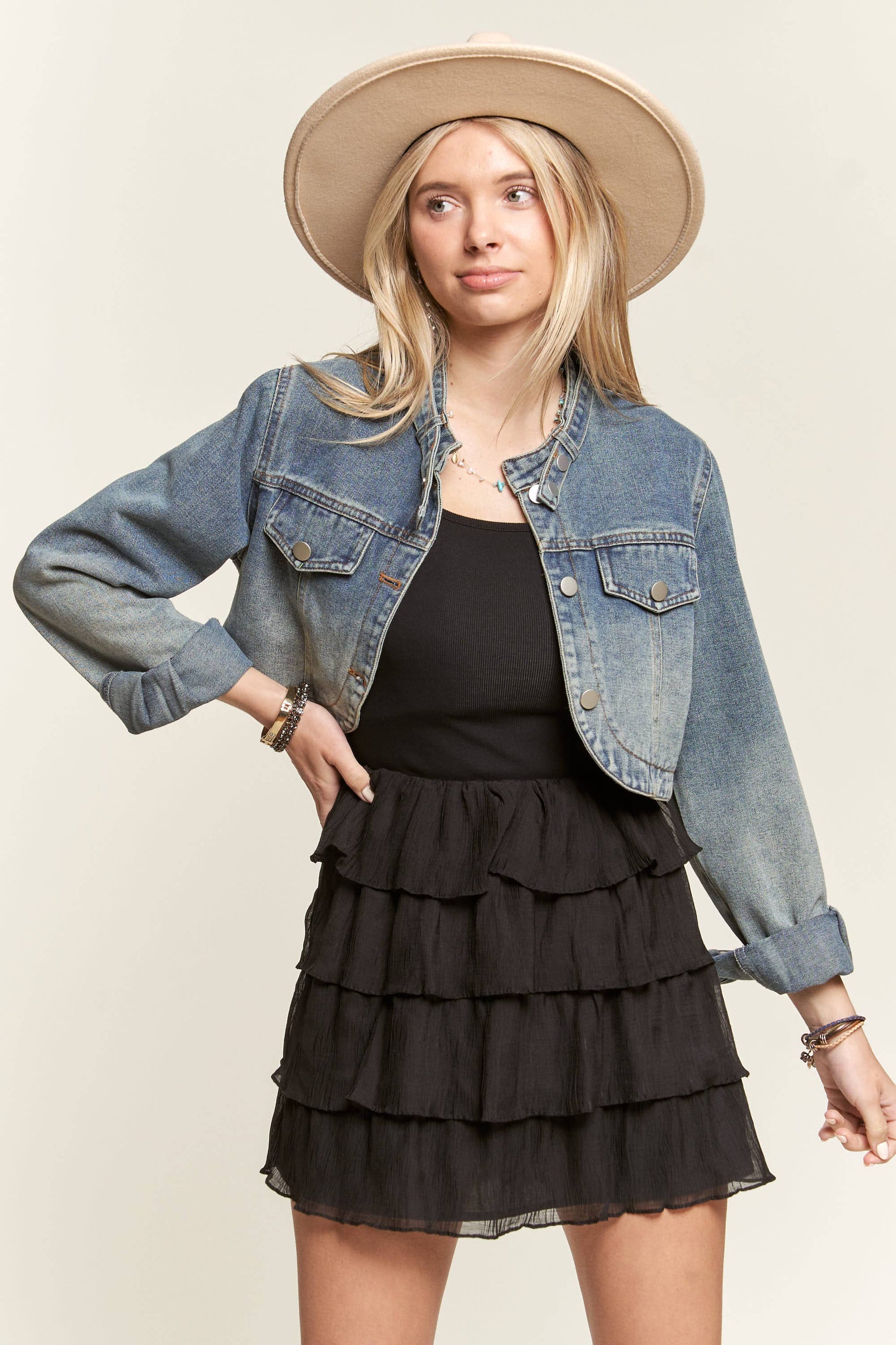 Washed cropped denim moto jacket with round hem 80% COTTON 20% POLYESTER MADE IN CHINA