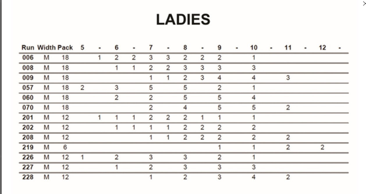 Available in size runs 006-008-009. See below size chart for breakdown.