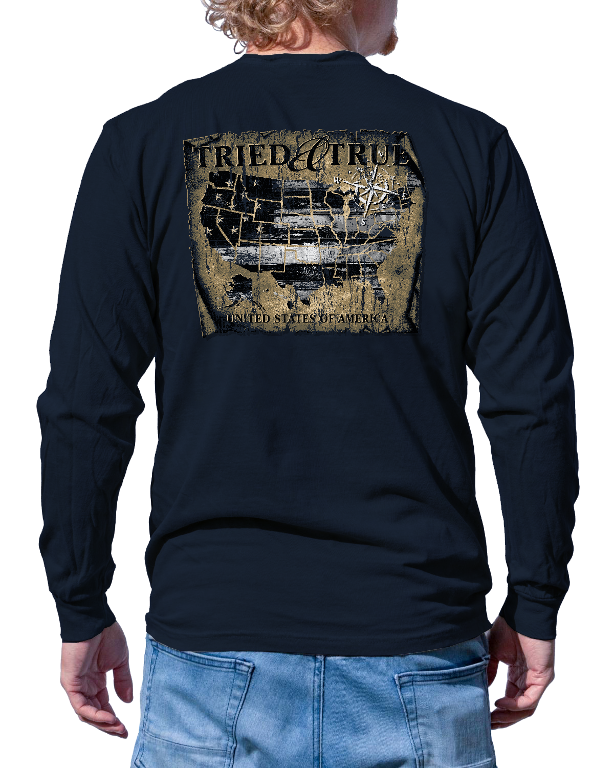 USA Map Long Sleeve T-Shirt. Printed on an 100% Cotton Ring-spun Garment Washed T-Shirt